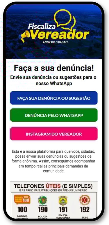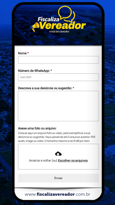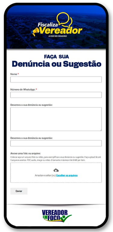 O sistema Fiscaliza Vereador! tem como objetivo ampliar a participação da população no acompanhamento dos mandatos parlamentares. Por meio da plataforma, os cidadãos poderão enviar denúncias e sugestões de forma simples, direta e eficiente, contribuindo ativamente com o trabalho do gabinete de seu vereador e fortalecendo a transparência e o controle social.